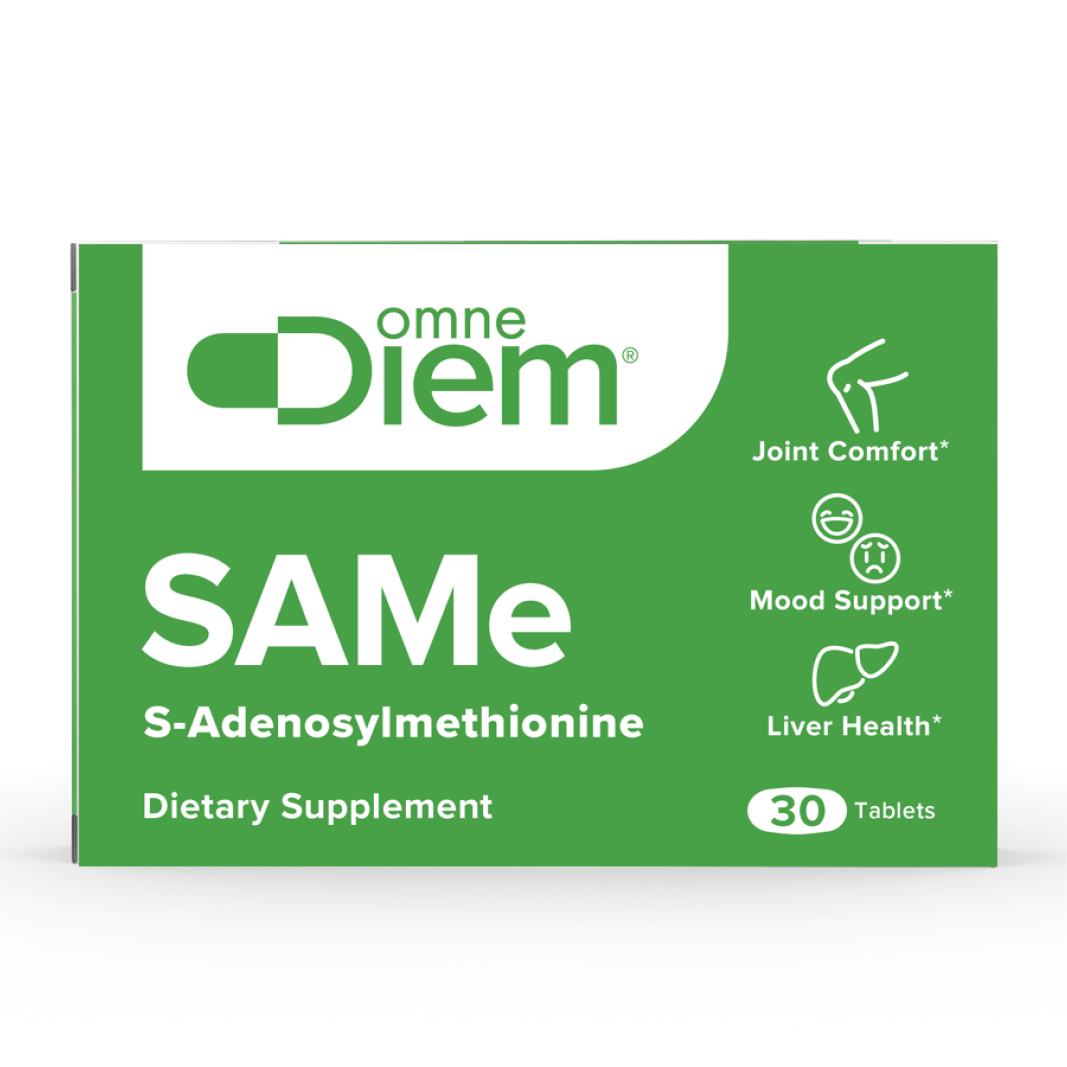 OmneDiem SAMe. S-Adenosylmethionine (SAMe) is a naturally occurring compound found in almost every tissue and fluid in the body. It is involved in many important processes associated with mood, joints, and liver.* Dietary Support for Joint Comfort, Mood, and Liver Health* Mood Support SAMe supplementation helps support sustained emotional well-being by promoting the production and break down of brain chemicals, such as serotonin, melatonin, and dopamine.* Liver Health SAMe helps restore and maintain healthy liver functions and detoxification by converting into glutathione; helping the liver combat oxidative stress, cellular damage, free radical activity and DNA breakdown.* Joint Comfort SAMe supplementation helps support cartilage and joint comfort and function by promoting native proteoglycan synthesis and secretion as well as other mechanisms.* Why OmneDiem SAMe? Stability and Safety Bioavailability GI Friendly